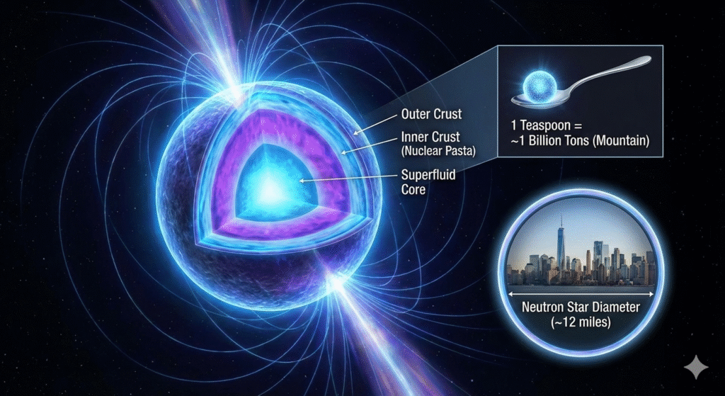 • The Teaspoon Analogy: A single teaspoon (or sugar cube) of neutron star material would weigh about 1 billion tons. That is equivalent to the weight of the entire human population, or a literal mountain, packed into a space the size of your thumb.