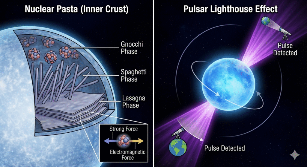 • Inner Crust: Here, “neutron drip” occurs. Neutrons begin to leak out of nuclei and form a sea of free neutrons. This is where “Nuclear Pasta” forms—strange shapes of matter resembling spaghetti or lasagna due to the competition between nuclear attraction and electrical repulsion.