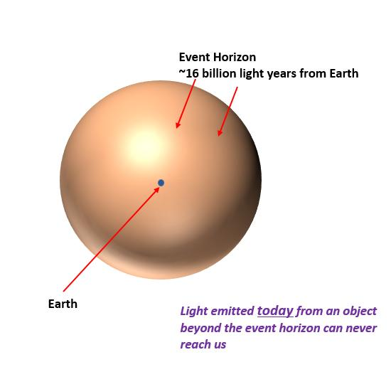 The cosmic event horizon is different,it shows the limit of what we will ever be able to see, even in the future. Due to the universe’s expansion, some galaxies are moving away so fast that their light will never reach us.