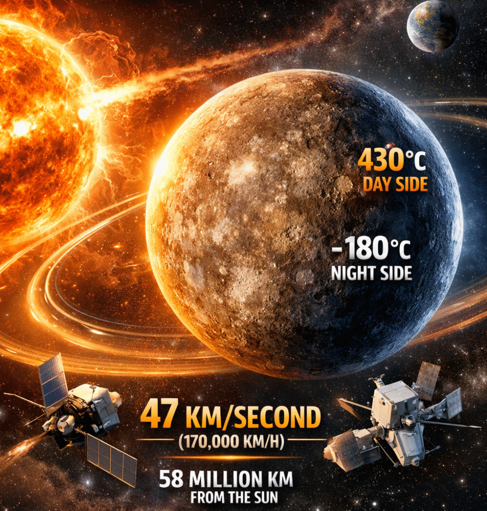 The planet Mercury completes a full orbit around the Sun in just 88 Earth days, making it the fastest-orbiting planet in the solar system. Scientists explain that this extraordinary orbital speed—averaging nearly 47 km per second—is driven primarily by Mercury’s extremely close distance to the Sun, where solar gravity is strongest. According to orbital mechanics, the closer a planet lies to the Sun, the greater the gravitational pull it experiences and the faster it must travel to remain in a stable orbit.