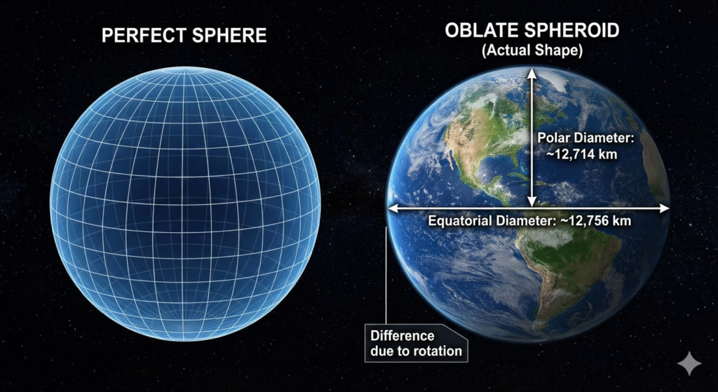 - The “Orange” Theory (Isaac Newton): Newton argued that because Earth spins, centrifugal force must pull the equator outward, making it look like a squashed orange (oblate).