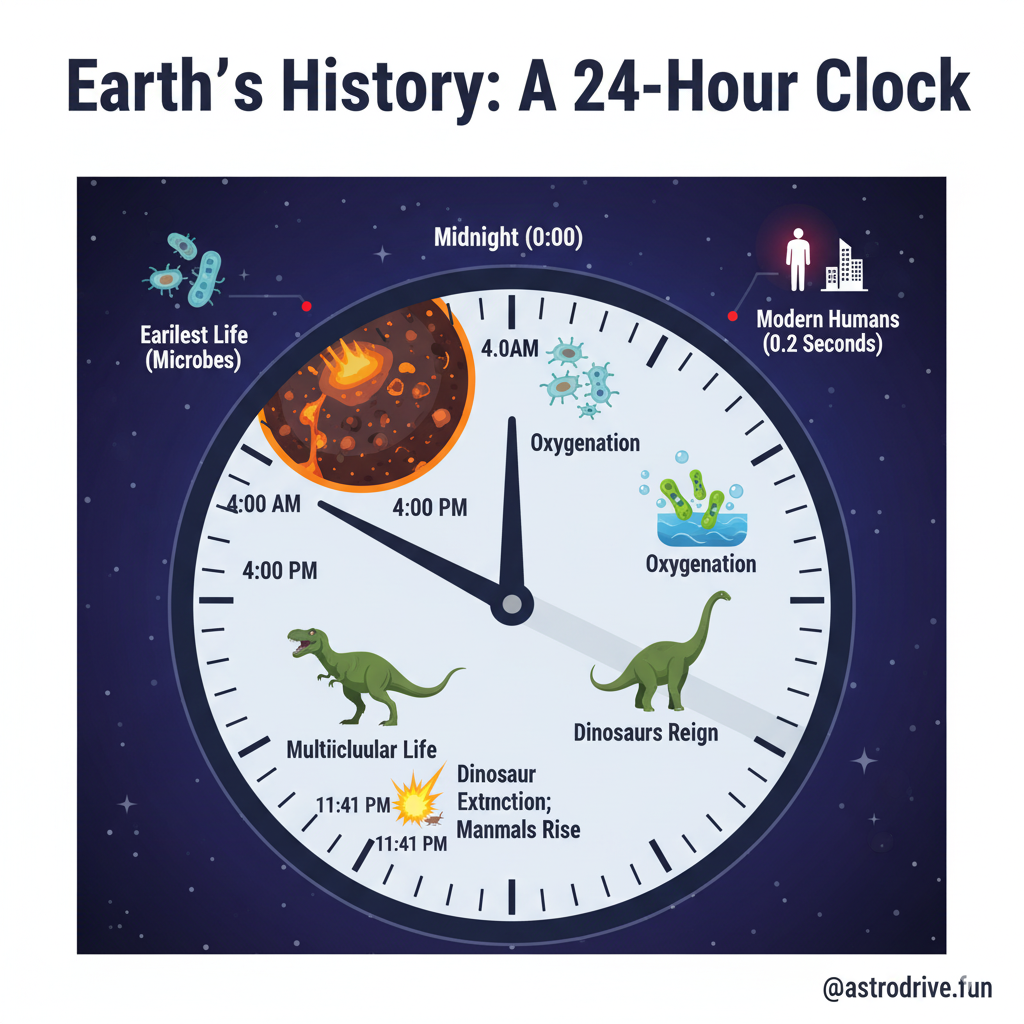 To truly grasp the brevity of our time here, let’s compress Earth’s entire 4.54-billion-year history into a single 24-hour day: