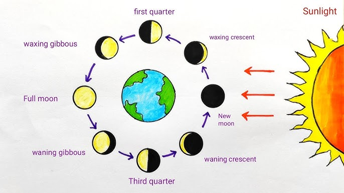 The Moon goes through different phases such as new moon, crescent, quarter, gibbous and full moon. These phases occur because different portions of the Moon are illuminated by the Sun as the Moon orbits the Earth. The phases are not caused by Earth’s shadow; they are simply the result of changing viewing angles between the Sun, Earth and Moon.