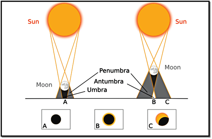A solar eclipse occurs when the Moon comes between the Sun and the Earth and blocks sunlight partially or completely. A total solar eclipse happens when the Sun is fully covered by the Moon, a partial solar eclipse occurs when it is only partly covered, and an annular eclipse occurs when a bright ring of the Sun remains visible. During a total solar eclipse, scientists can observe the Sun’s outer atmosphere called the corona.