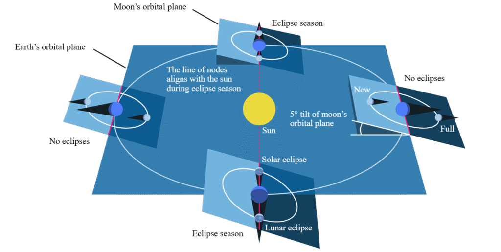 Eclipses do not occur every month because the Moon’s orbit is tilted by about 5° relative to Earth’s orbit around the Sun. Most of the time, the Moon passes above or below Earth’s shadow. Eclipses only occur during special periods called eclipse seasons, which happen about twice each year.