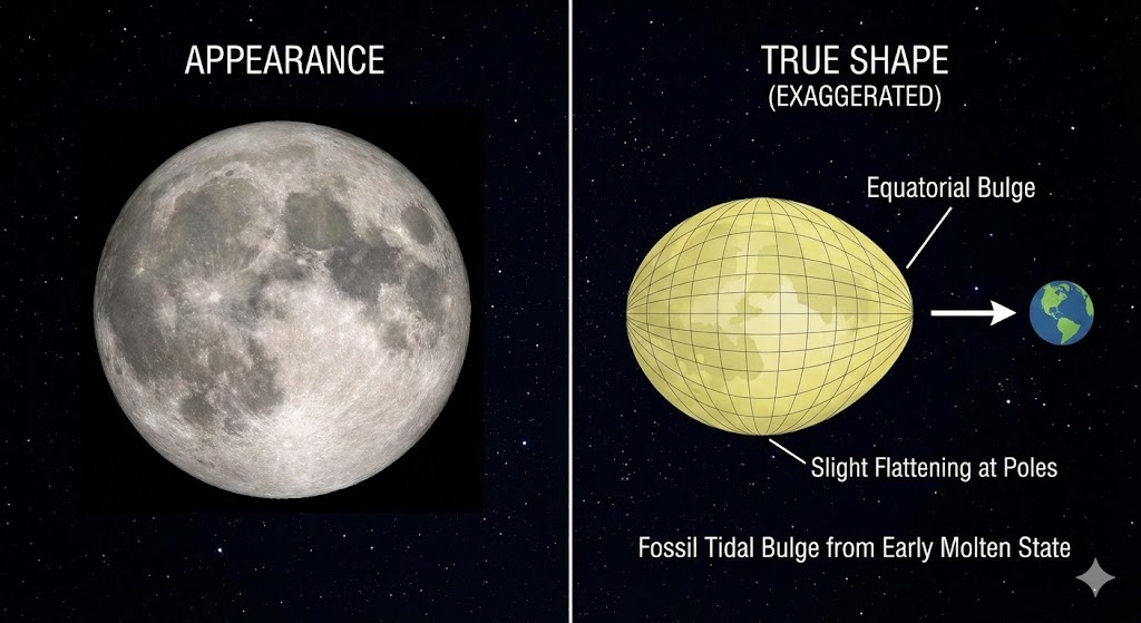 • The “Fossil Bulge”: As the Moon cooled and moved further away from Earth, its outer crust solidified, “freezing” these bulges in place. Scientists call this a Fossil Bulge because it represents a shape the Moon should have had billions of years ago, not what it would have if it formed today.