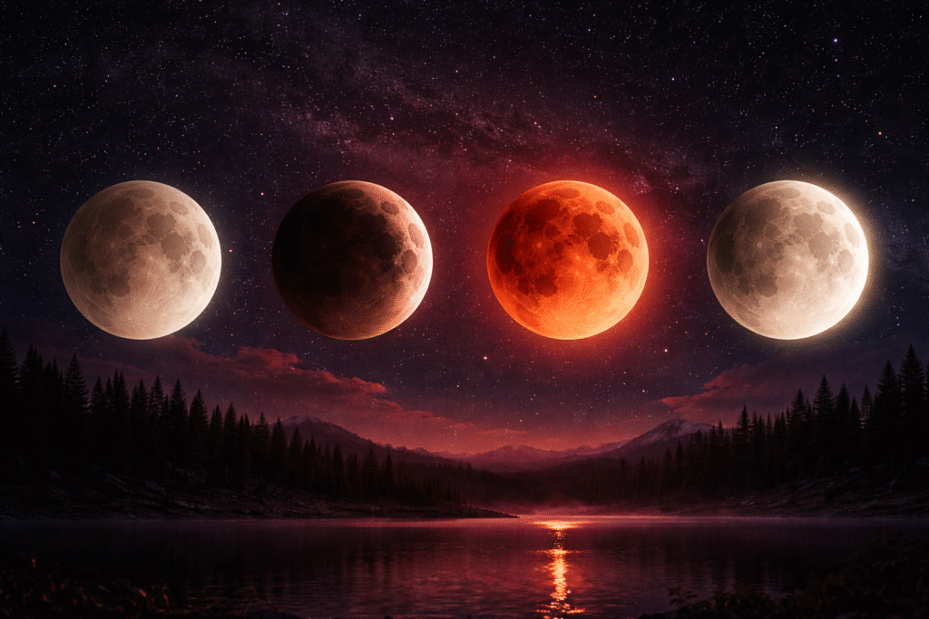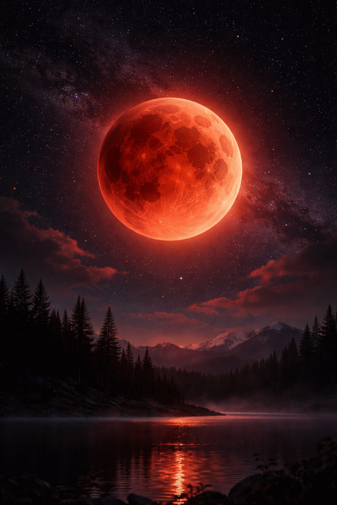 A Total Lunar Eclipse happens when the Earth moves directly between the Sun and the Moon, casting its full shadow on the Moon. During totality, the Moon turns a deep reddish color this is why it’s often called a “Blood Moon.”