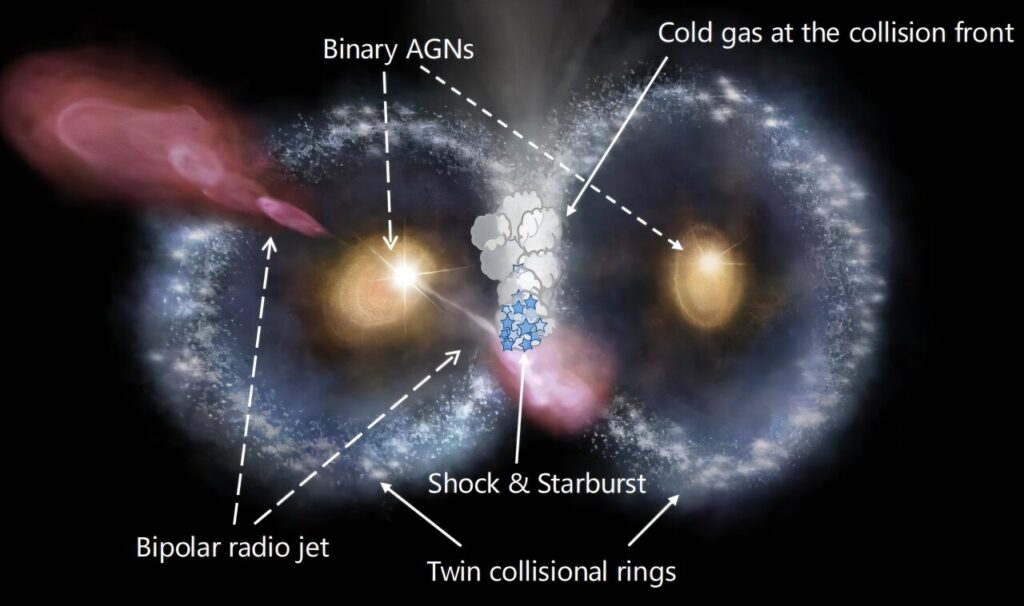 Each of the two rings contains an active galactic nucleus, meaning both galaxies host supermassive black holes at their centers. As the galaxies interact, their gravitational forces create extreme and chaotic conditions.
